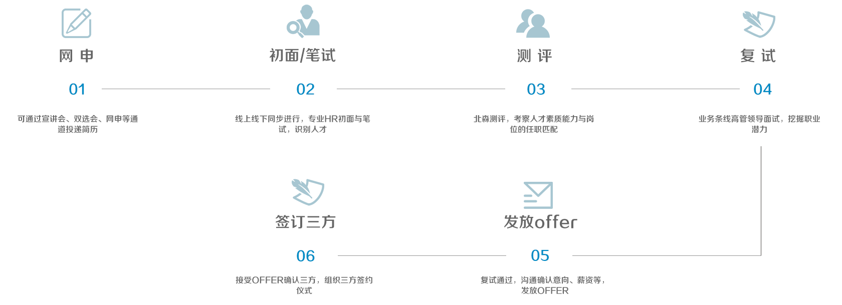 簡歷投遞(網申)>初面/筆試>測評>復試>發放offer>簽訂三方